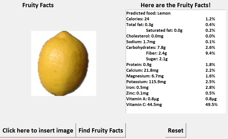 This was a creative collaboration between a group of friends that uses machine learning (ML) techniques. By simply providing an image of a fruit, Fruity Facts harnesses a trained ML model built on the TensorFlow framework to identify the given fruit. We trained the ML model on tens of thousands of fruit images, fine-tuning it through seven iterations. As a result the model was successfully built with an accuracy rate of 99.8%. The program then calls the Edamam API, enabling users to access comprehensive nutritional information for the identified fruit. It displays the exact composition, vitamins, minerals, and other essential nutrients with a single click.