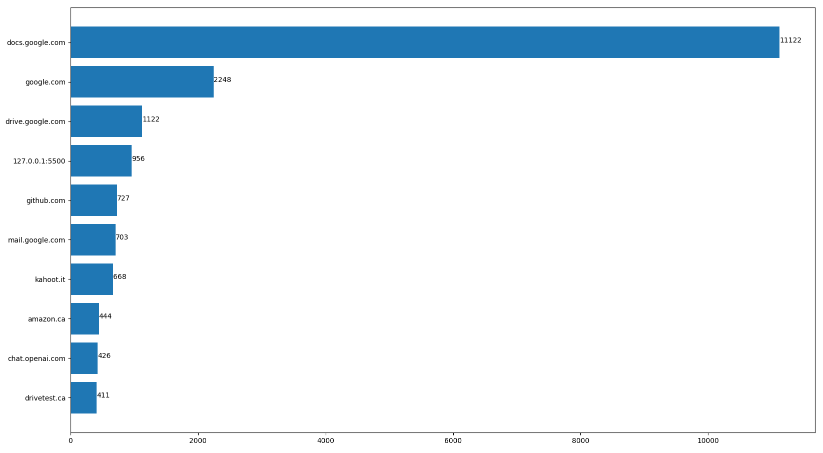 This program uses the sqlite3 Python library, this tool queries the user’s local browser database, extracting tons of information. This includes records of every website the user has visited, along with the corresponding date and time of each visit, as well as the duration spent on each site. The program then parses through the URLs and calculates the frequency of each domain, generating comprehensive visit counts. The program can then display the results in a textual format, or in a graphical format. It uses Python’s matplotlib module to graph the user’s top 10 most frequently visited websites.
